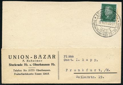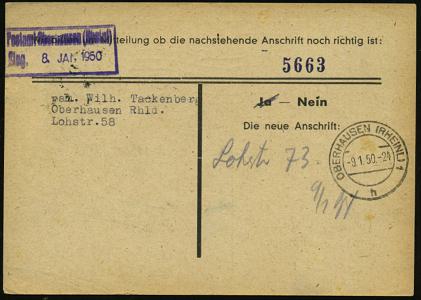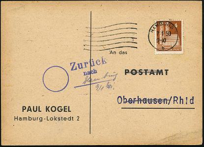 7097 | 25 € | 4200 Oberhausen allgem. Belege, Tages-, Sonder- u. Maschinenstempel etc. : Oberhausen/ Rhld. 1950 (7.1.) viol. 3L: Zurück/nach.. von Oberhausen, rs. 2K-Steg: OBERHAUSEN (RHEINL) 1/h + viol. Ra.: Postamt Oberhausen (Rheinl)/Eing. , EF 4 Pf. Bauten (Mi.74 eg) Inl.-Retour-Anschriftenprüfung aus Hamburg, seltener Beleg! | ![]() ![]() | |