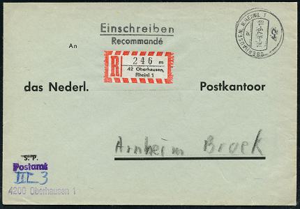 7101 | 15 € | 4200 Oberhausen allgem. Belege, Tages-, Sonder- u. Maschinenstempel etc. : 4200 Oberhausen 1 1978 (ca.) viol. 1K-HdN: POSTAMT/ oberhausen, RHEINL 1 + RZ: 4200 Oberhausen,/ Rheinl 1/f auf Ausl.-Postdienst-Bf.: Postsache/ Service des postes n. Holland | ![]() | |