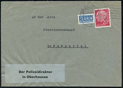 7098 | 18 € | 4200 Oberhausen allgem. Belege, Tages-, Sonder- u. Maschinenstempel etc. : (22a) OBERHAUSEN (RHEINL)/ p 1956 (24.5.) MaWellenSt auf EF 20 Pf. Heuss I mit kopfstehender, später Behörden-Lochung: "P O L" (IZEI), Fern-Dienstbf.: Der Polizeiderektor in Oberhausen (Mi.185 ,EF , Perfin POL) | ![]() | |