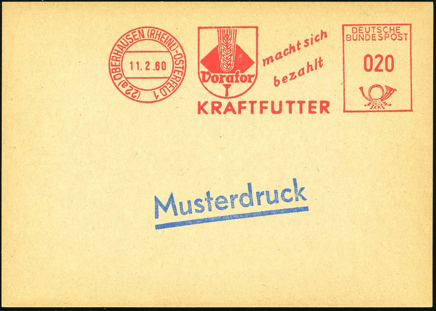 7114 | 20 € | 4200 Oberhausen Post- u. Absender-Freistempel : (22a) OBERHAUSEN (RHEIN)-OSTERFELD 1/ Vorator/ ..KRAFTFUTTER 1960 (11.2.) AFS-Musterabdruck Francotyp "Posthorn" (Wappen mit Ähre) + blauer 1L: "Musterdruck" glasklar auf seltener Francotyp-Archivkt.! (Dü.E-23CO) | ![]() | |