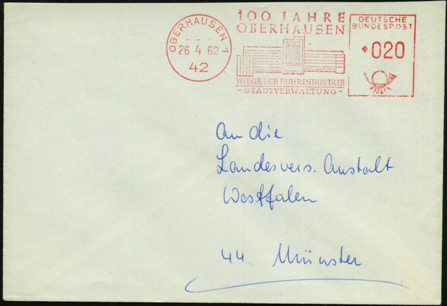7116 | 15 € | 4200 Oberhausen Post- u. Absender-Freistempel : 42 OBERHAUSEN 1/ 100 JAHRE/ OBERHAUSEN/ WIEGE DER RUHRINDUSTRIE/ STADTVERWALTUNG 1962 (26.4.) Jubil.-AFS Francotyp, 1K-Ortsstempel mit k l e i n e r PLZ , klar gest. Kommunalbf., rs. Abs.-Vordruck, vergl. Kat.-Nr. 7117 (Dü.E-23DO, Sonderform, neue kleine PLZ) | ![]() ![]() | |
