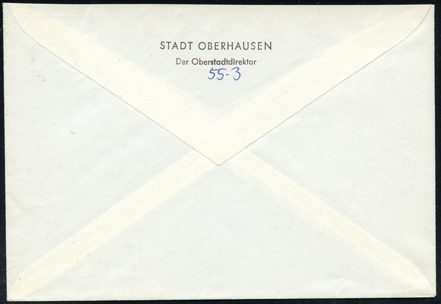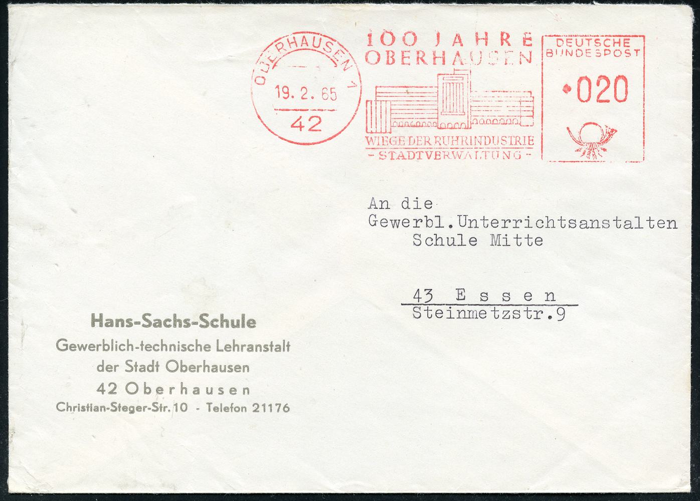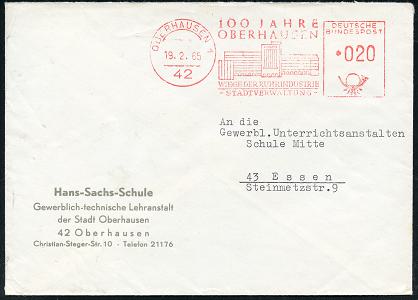 7117 | 12 € | 4200 Oberhausen Post- u. Absender-Freistempel : 42 OBERHAUSEN 1/ 100 JAHRE/ OBERHAUSEN/ WIEGE DER RUHRINDUSTRIE/ STADTVERWALTUNG 1965 (19.2.) Jubil.-AFS, neuer, großer 1K-Segment-Orts-Stpl. , klar gest. Kommunalbf.: Hans-Sachs-Schule.., vergl. Kat.-Nr.7116 (Dü.E-23DO, geänderter Orts-Stpl.) | ![]() | |