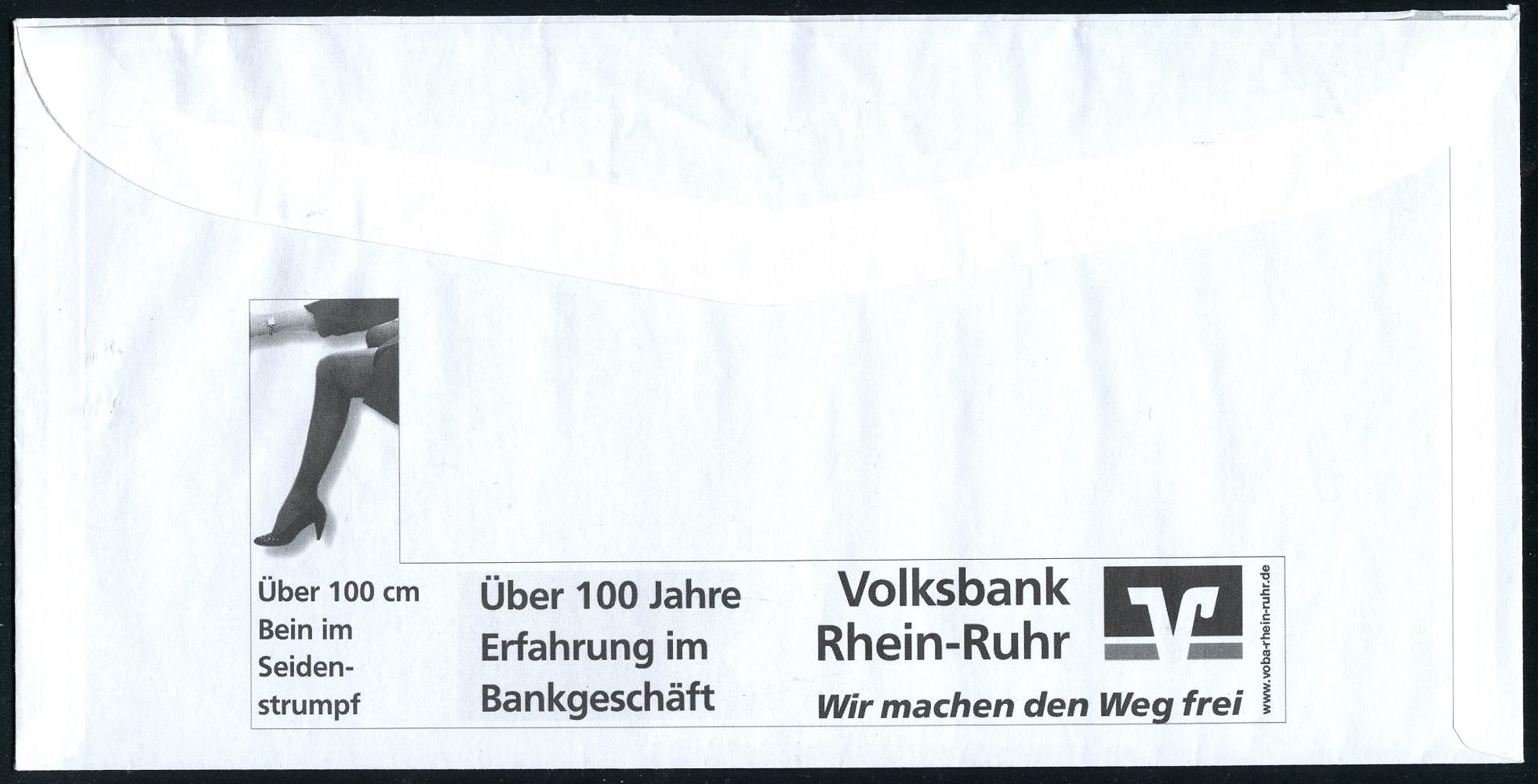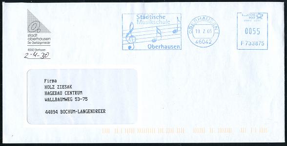 7122 | 8 € | 4200 Oberhausen Post- u. Absender-Freistempel : 46042 OBERHAUSEN/ F733875/ Städt./ Musikschule 2003 (19.2.) blauer AFS Postalia mit Kennung = Notenschlüssel, Noten , Kommunal-Bf., rs. Reklame "Volksbank Rhein-Ruhr" | ![]() ![]() | |