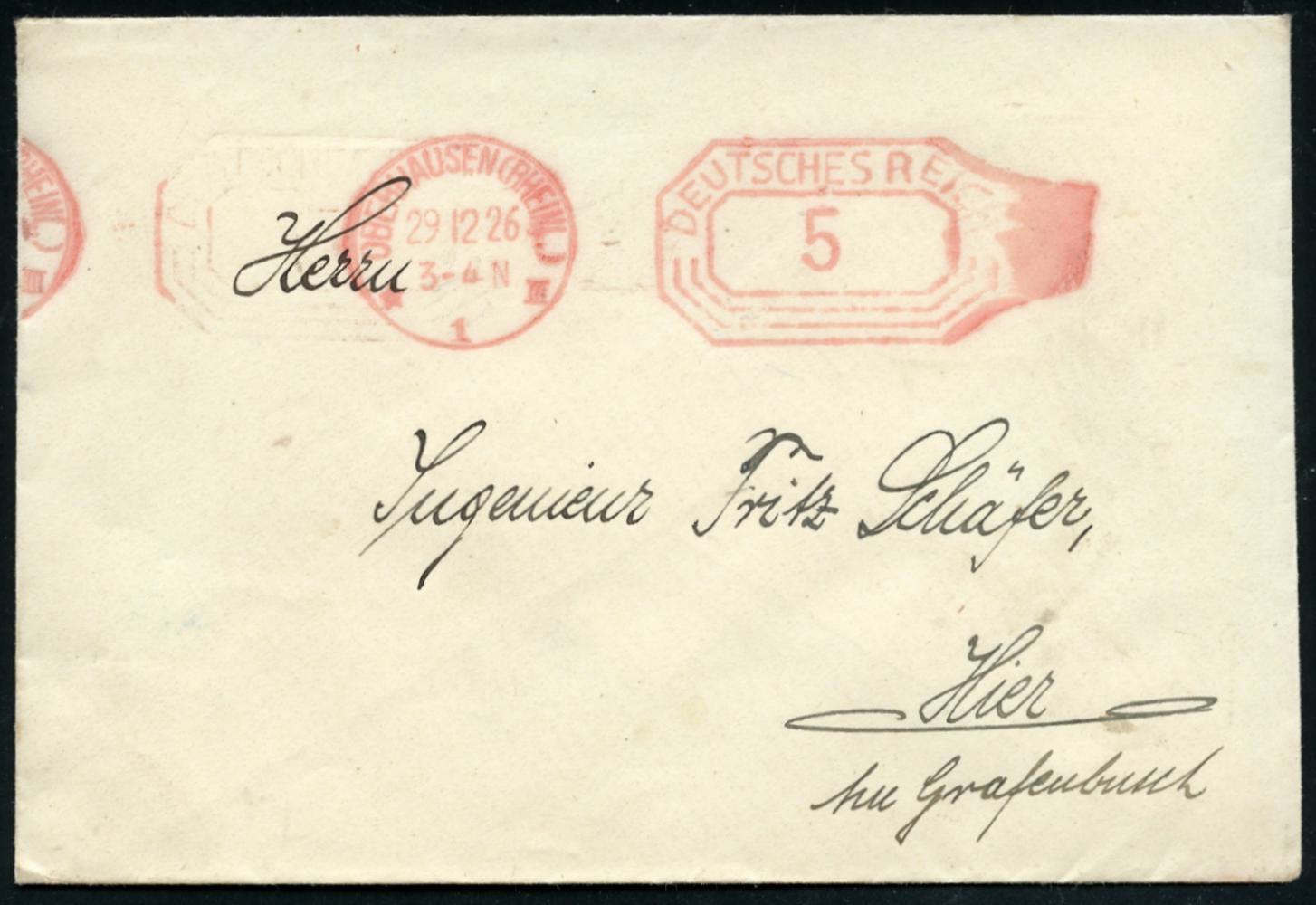 7105 | 16 € | 4200 Oberhausen Post- u. Absender-Freistempel : OBERHAUSEN (RHEINL:)/ * 1 III/ DEUTSCHES REICH 1926 (29.12.) PFS "Achteck" 5 Pf. auf kleinem Orts-Bf. (Dü.D-4) | ![]() | |