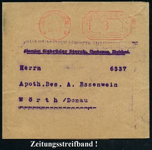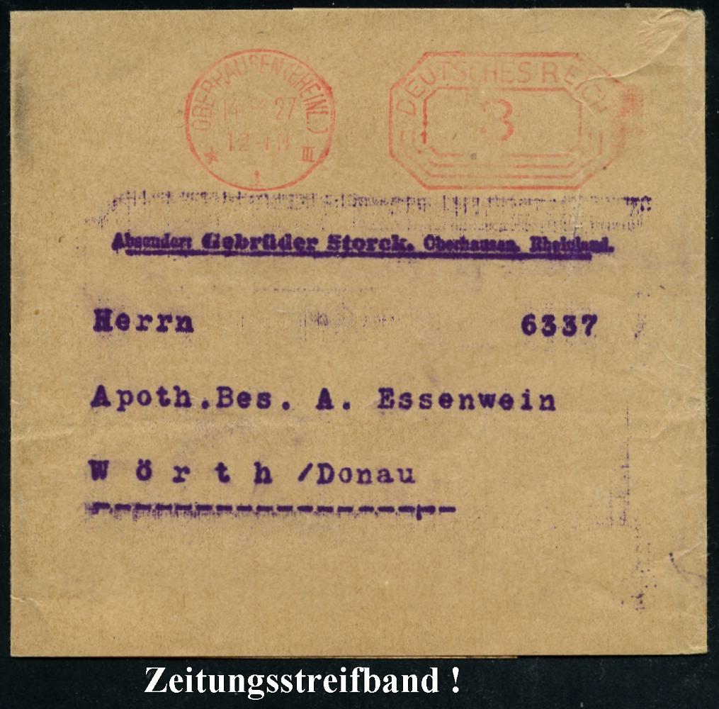 7106 | 12 € | 4200 Oberhausen Post- u. Absender-Freistempel : OBERHAUSEN (RHEINL.)/ * 1 III/ DEUTSCHES REICH 1927 (14.3.) PFS "Achteck" auf Zeitungs-Streifband: Gebr. Storck, Oberhausen.. (Dü.D-4) | ![]() | |