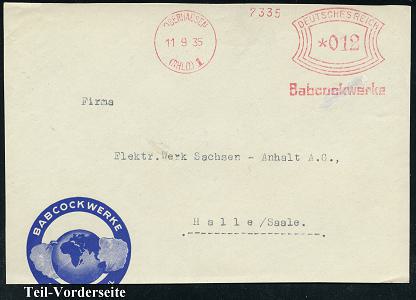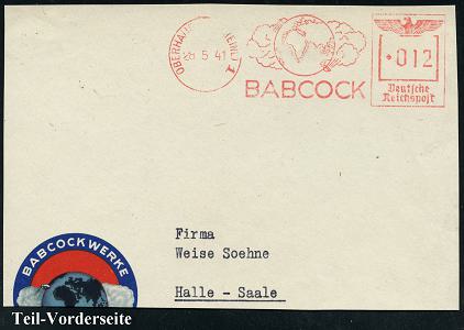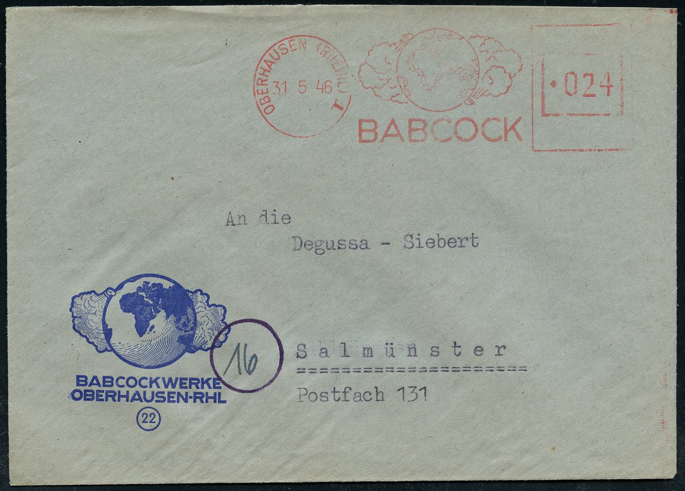 7110 | 28 € | 4200 Oberhausen Post- u. Absender-Freistempel : OBERHAUSEN/ (RHLD.)1/ Babcockwerke 1946 (31.5.) aptierter AFS Francotyp "Reichsadler" = entfernt + Inschrift = Notmaßnahme! (Globus u. Wolken) motivgl. Firmen-Bf. (Dü.E-13 AK-147o) | ![]() | |