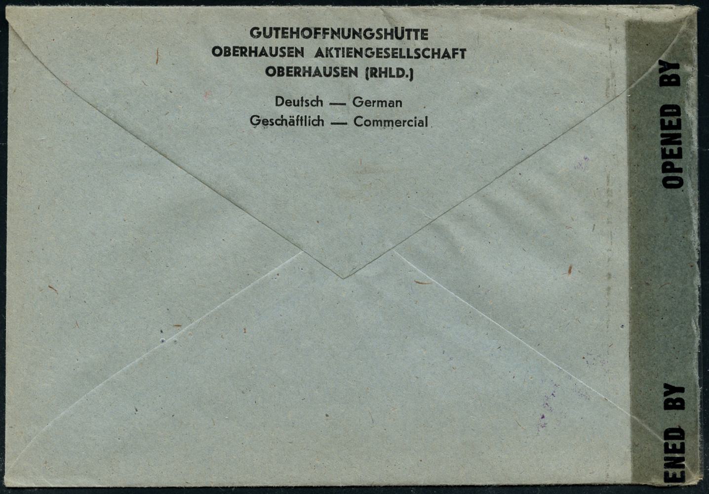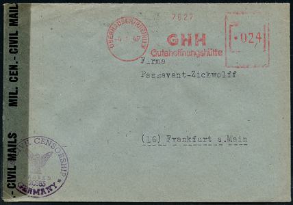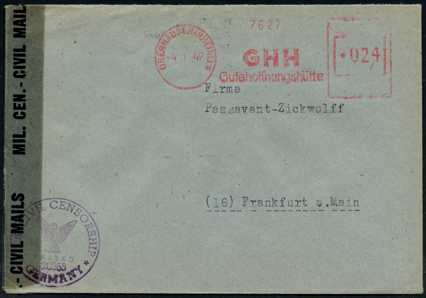 7111 | 30 € | 4200 Oberhausen Post- u. Absender-Freistempel : OBERHAUSEN (RHEINL) 1/ GHH/ Gutehoffnungshütte 1947 (4.1.) aptierter AFS Francotyp "Reichsadler" = entfernt + Inschrift = Notmaßnahme! + viol. US-Zensur-1K: CIVIL CENSORSHIP/ PASSED/ 20365 + Zensurstreifen: OPENED BY/ MIL. CEN.-CIVIL MAILS (= Offenbach, Rie.A-2, A-102) Inl.-Zensur-Bf. n. Ffm. (Dü.E-13 AK-147h) | ![]() ![]() | |