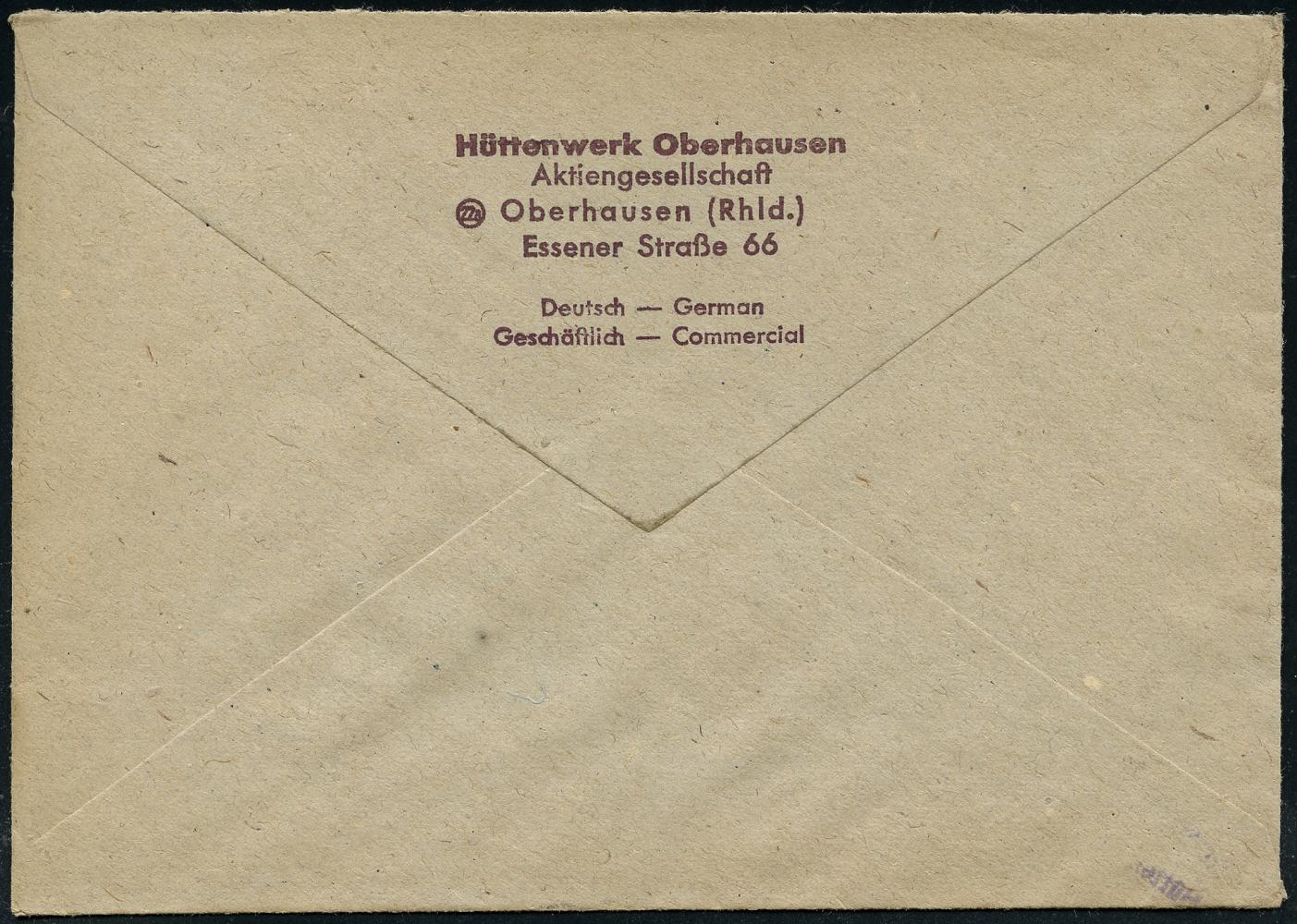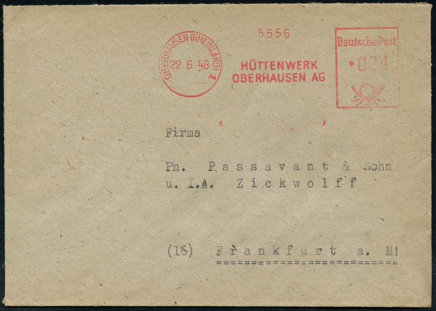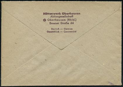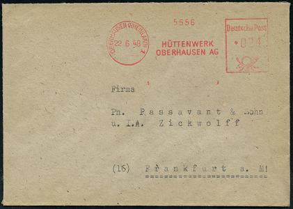 7112 | 18 € | 4200 Oberhausen Post- u. Absender-Freistempel : OBERHAUSEN (RHEINLAND) 1/ HÜTTENWERKE/ OBERHAUSEN AG 1948 (22.6.) AFS Francotyp "Posthorn" , rs. Abs.-Vordruck, Firmen-Fern-Bf. (Dü.E-20DGh mit Raute) | ![]() ![]() | |