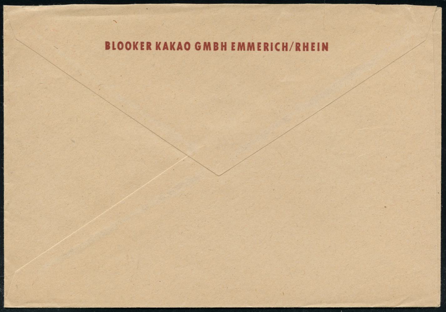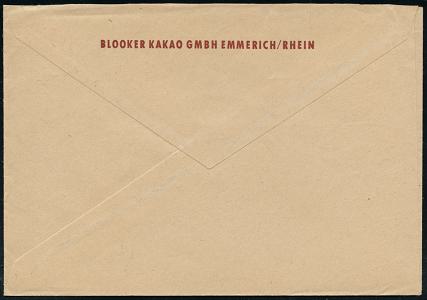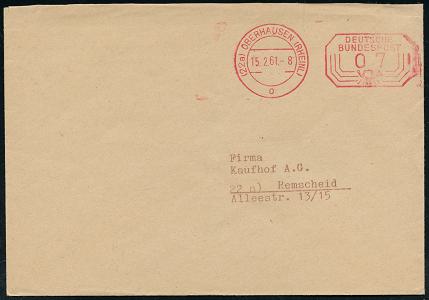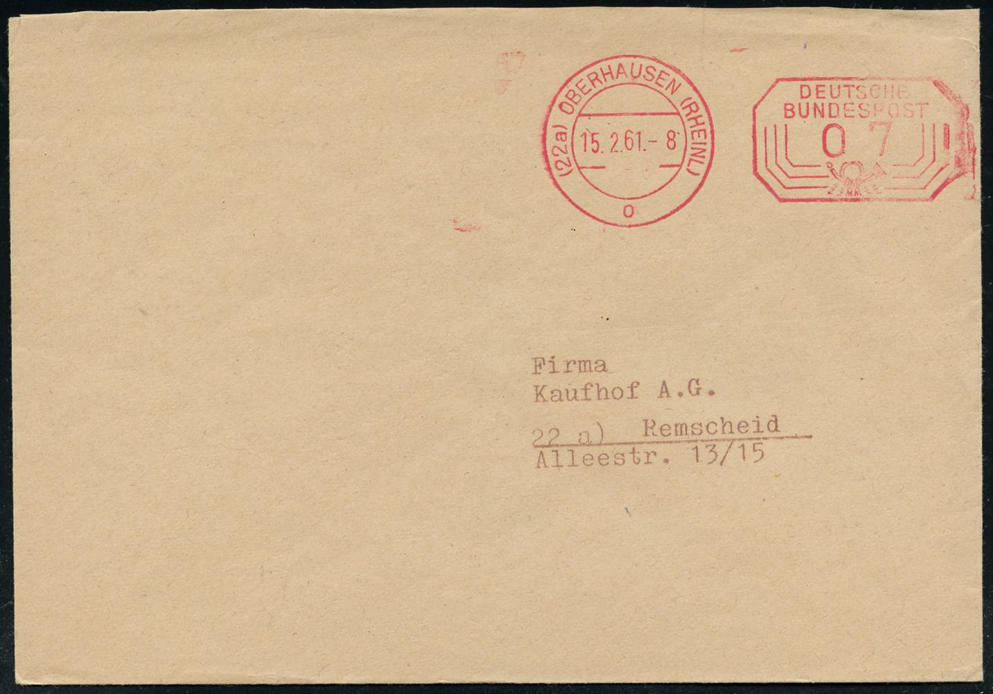 7115 | 12 € | 4200 Oberhausen Post- u. Absender-Freistempel : (22a) OBERHAUSEN (RHEINL)/ o/ DEUTSCHE/ BUNDESPOST 1961 (15.2.) PFS Achteck "Posthorn" 07 Pf. , rs. Abs.-Vordruck: BLOOKER KAKAO GMBH EMMERICH.. (Dü.D-16, Nr.272 mit 4 Blitzen) | ![]() ![]() | |