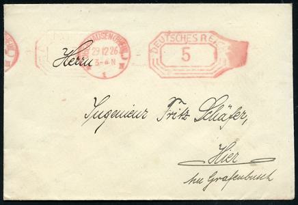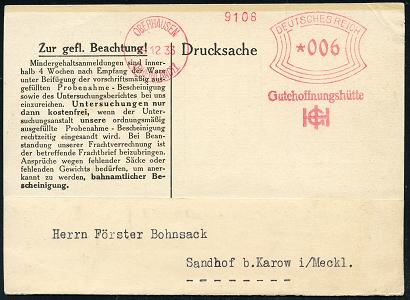 7107 | 25 € | 4200 Oberhausen Post- u. Absender-Freistempel : OBERHAUSEN/ (RHEINLAND)1/ Gutehoffnungshütte 1933 (9.12.) AFS Francotyp "Bogenrechteck" (Monogr.-Logo) klar gest. Firmen--Kt.: Thomasphospatfabriken GmbH mit Firmen-Logo (Dü.E-1Ah) | ![]() ![]() | |