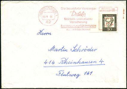7119 | 18 € | 4200 Oberhausen Post- u. Absender-Freistempel : 42 OBERHAUSEN 1/ ..Debeka/ Kranken-u.Lebens-/ Versicherung.. 1966 (19.9.) AFS Francotyp 020 Pf. als Vorausentwertung auf 30 Pf. Kant (Randstück) portorichtiger Fern-Doppel-Bf. n. Rheinhausen (Dü.E-23CO + Mi.354) | ![]() | |