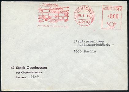 7121 | 12 € | 4200 Oberhausen Post- u. Absender-Freistempel : 4200 OBERHAUSEN,RHEINL 1/ Städt./ Konzerte../ STADTVERWALTUNG 1980 (2.6.) AFS Francotyp (Notenzeile) Bürgermeister-Bf. (Dü.E-26) | ![]() | |