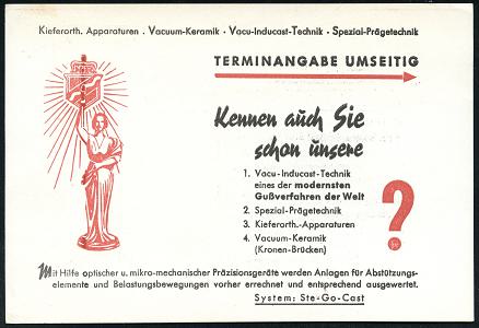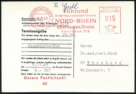 7118 | 15 € | 4200 Oberhausen Post- u. Absender-Freistempel : 42 OBERHAUSEN 1/ Führend/ in der Vacu-Inducast-Technik/ NORD-RHEIN.. 1963 (28.10.) AFS Francotyp 015 Pf. auf zweifarbiger Reklame-Kt. für Gußtechnik (Dü.E-23CO) | ![]() ![]() | |