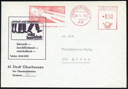 7120 | 14 € | 4200 Oberhausen Post- u. Absender-Freistempel : 42 OBERHAUSEN 1/ Städtische Bühnen/ Oberhausen/ STADTVERWALTUNG 1970 (26.1.) AFS Francotyp (Theater-Scheinwerfer) kommunaler Reklame-Bf.: volks hochschule.. (Dü.E-26) | ![]() | |