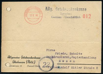 7109 | 18 € | 4200 Oberhausen Post- u. Absender-Freistempel : OBERHAUSEN (RHEINL) 1 1946 (12.5.) total aptierter AFS Francotyp = Wertrahmen u n d Klischee entfernt + viol. 3L zugestempelt: Allg. Ortskrankenkasse.., Firmen-Kt. (Reg.-Lochung geschl.) n. Essen (Dü.E-16-242 CGo = seltene Type!) | ![]() | |