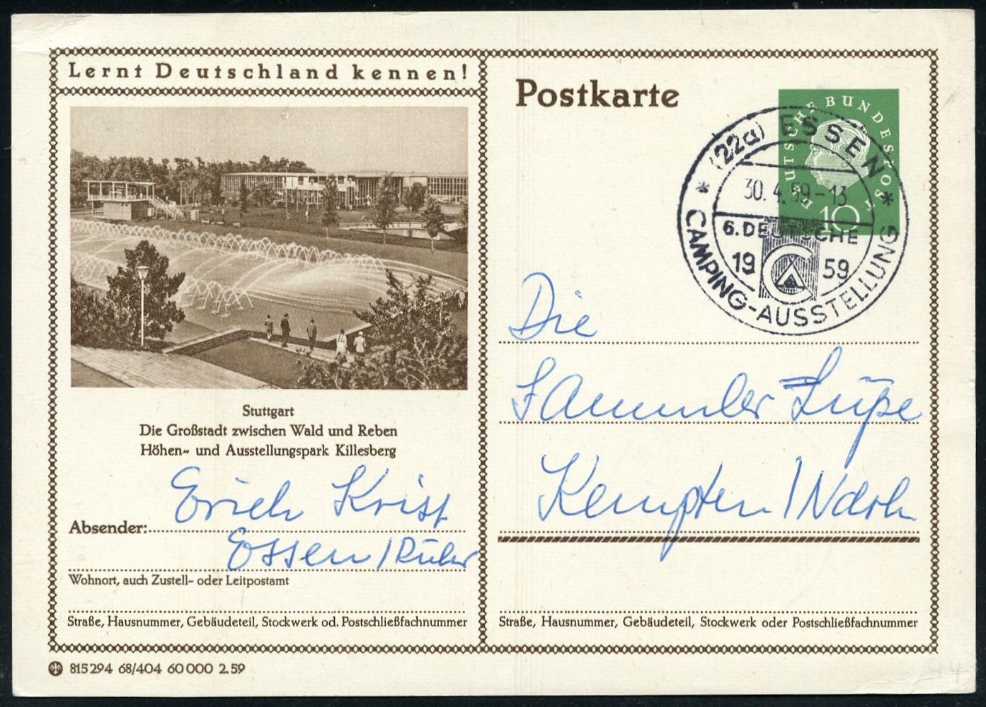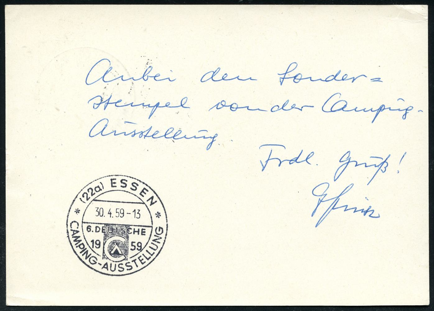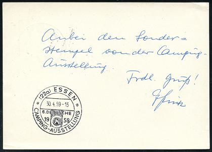 7266 | 12 € | 4300 Essen Sonder- u. Handwerbe-Stempel : (22a) ESSEN/ CAMPING-AUSSTELLUNG 1959 (30.4.) SSt (Camping-Logo) klar gest. Inl.-Karte (Bo.94) | ![]() ![]() | |