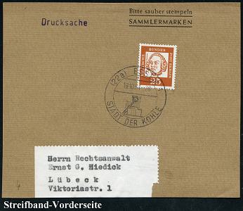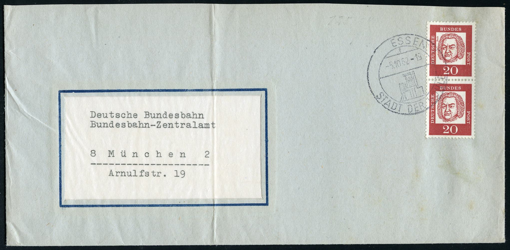 7269 | 18 € | 4300 Essen Sonder- u. Handwerbe-Stempel : (22a) ESSEN 1/ e #bzw.# f/ STADT DER KOHLE 1961/62 HWSt mit alter PLGZ (Förderturm) bzw. aptierte PLGZ = entfernt , Streifband-Vorderseite bzw. Fern-Bf. (gefaltet), 2 Belege! (Bo.125, 125 aptiert) | ![]() ![]() | |