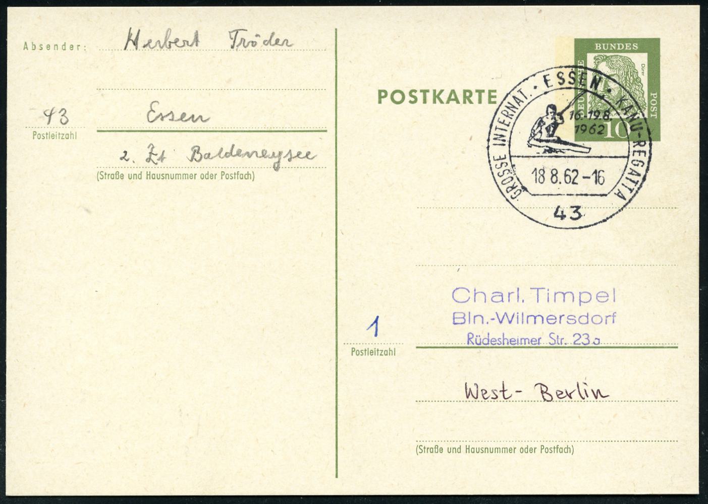 7272 | 10 € | 4300 Essen Sonder- u. Handwerbe-Stempel : 43 ESSEN/ GROSSE INTERN. KANU-REGATTA 1962 (18.8.) SSt = Kajak-Einer , klar gest. Inl.-Karte, vergl. Kat.-Nr. 7273 (Bo.141) | ![]() | |
