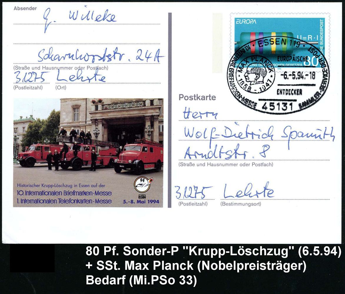 7291 | 8 € | 4300 Essen Sonder- u. Handwerbe-Stempel : 45131 ESSEN 119/ MAX PLANCK/ 10.INTERNAT.BRIEFMARKEN-MESSE.. 1994 (6.5.) SSt = Max Planck-Medaille auf passender Sonder-P. 80 Pf.: 10. Internat. Briefm.-Messe = Feuerwehr-Kfz. (Mi.PSo 33), Bedarf | ![]() | |