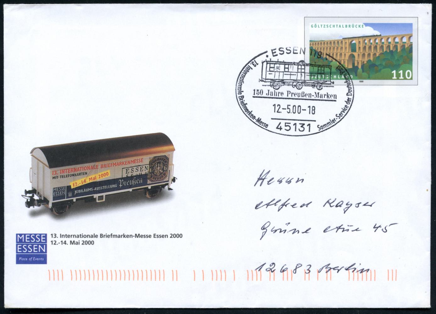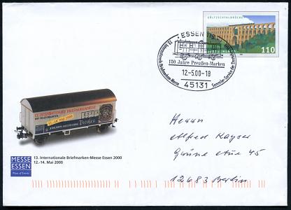 7293 | 6 € | 4300 Essen Sonder- u. Handwerbe-Stempel : 45131 ESSEN 119/ 150 Jahre Preußen-Marken.. 2000 (12.5.) SSt = preuß. Bahnpostwaggon , motiv-ähnl. PU 110 Pf. Göltzschtalbrücke (13. Internat. Briefm.-Messe Essen), Bedarf | ![]() | |