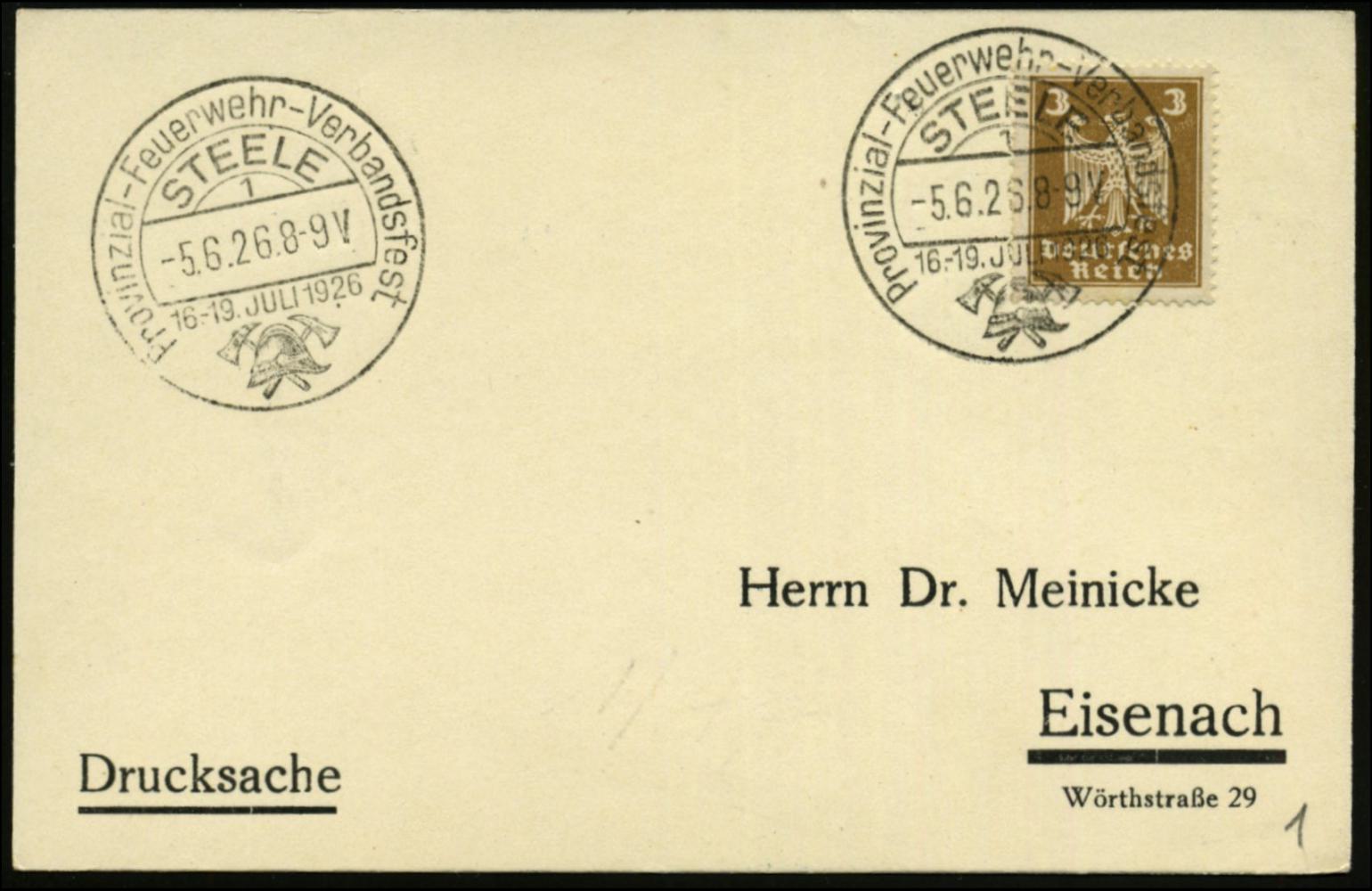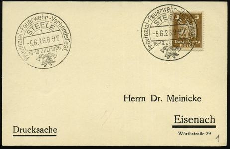 7240 | 20 € | 4300 Essen Sonder- u. Handwerbe-Stempel : Essen-Steele 1926 (5.6.) seltener HWSt.: STEELE/ Provinzial-Feuerwehr-Verbandsfest = Feuerwehrhelm (u. 2 Äxte) klar gest. Inl.-Karte (Bo.1) | ![]() | |
