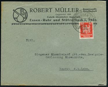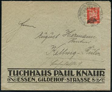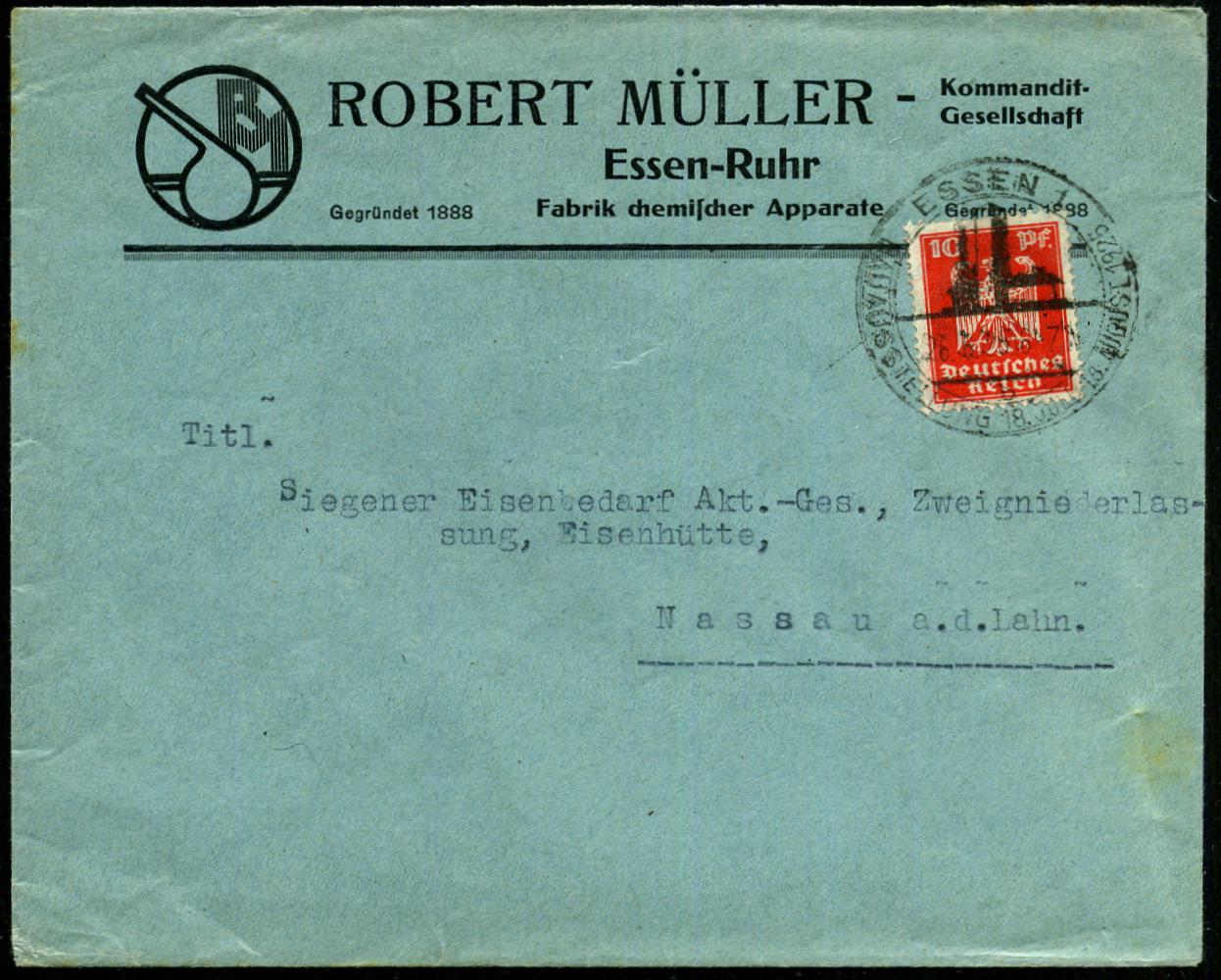 7241 | 28 € | 4300 Essen Sonder- u. Handwerbe-Stempel : ESSEN 1/ b/ BAUAUSSTELLUNG.. 1925 (26.6.) seltener HWSt (= Gebäude-Silhouette) auf Reklame-Bf.: ROBERT MÜLLER KG.. Fabrik chemischer Apparate = Glaskolben + Monogramm , Fern-Firmen-Bf. (Bo.9 b) | ![]() | |