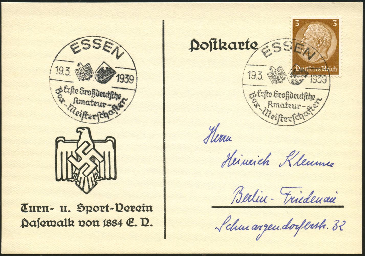 7250 | 20 € | 4300 Essen Sonder- u. Handwerbe-Stempel : ESSEN/ Erste Großdeutsche/ Amateur-/ Box-Meisterschaften 1939 (19.3.) SSt klar auf seltener Vordruck-Kt.: Turn- u. Sportverein Pasewalk v. 1884 E.V. (Logo: Reichsbund für Leibesübungen) klar gest. Inl.-Karte (Bo.33) | ![]() | |
