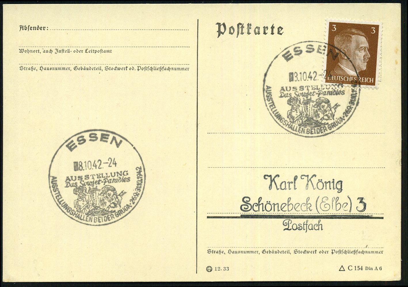 7254 | 18 € | 4300 Essen Sonder- u. Handwerbe-Stempel : ESSEN/ AUSSTELLUNG/ Das Sowjet-Paradies/ AUSSTELLUNGSHALLEN..GRUGA 1942 (Okt.) SSt = proletarisches Paar mit Hunger-Kind , klar gest. Inl.-Karte (Bo.40) | ![]() | |