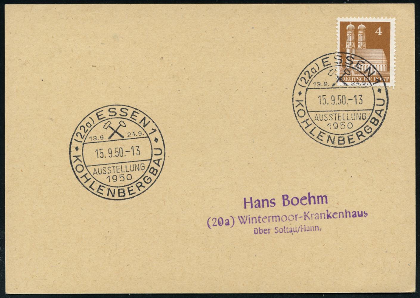 7258 | 12 € | 4300 Essen Sonder- u. Handwerbe-Stempel : (22a) ESSEN 1/ AUSSTELLUNG/ KOHLENBERGBAU 1950 (15.9.) SSt (2 Bergbauhämmer) klar gest. Inl.-Drs.-Karte (Bo.51) | ![]() | |