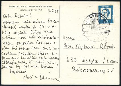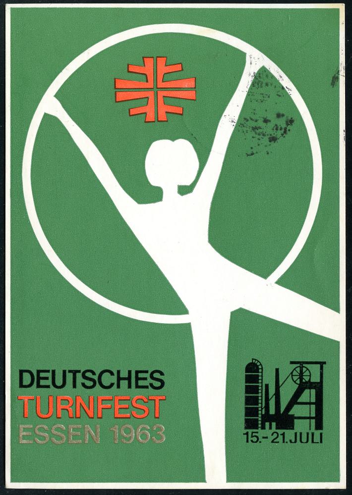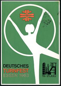 7274 | 18 € | 4300 Essen Sonder- u. Handwerbe-Stempel : 43 ESSEN/ DTB/ a/ DEUTSCHES TURNFEST 1963 (17.7.) SSt (Frau mit Turn-Reifen) motivgl. Color-Sonderkt., Bedarf (Bo.152 a) | ![]() ![]() | |