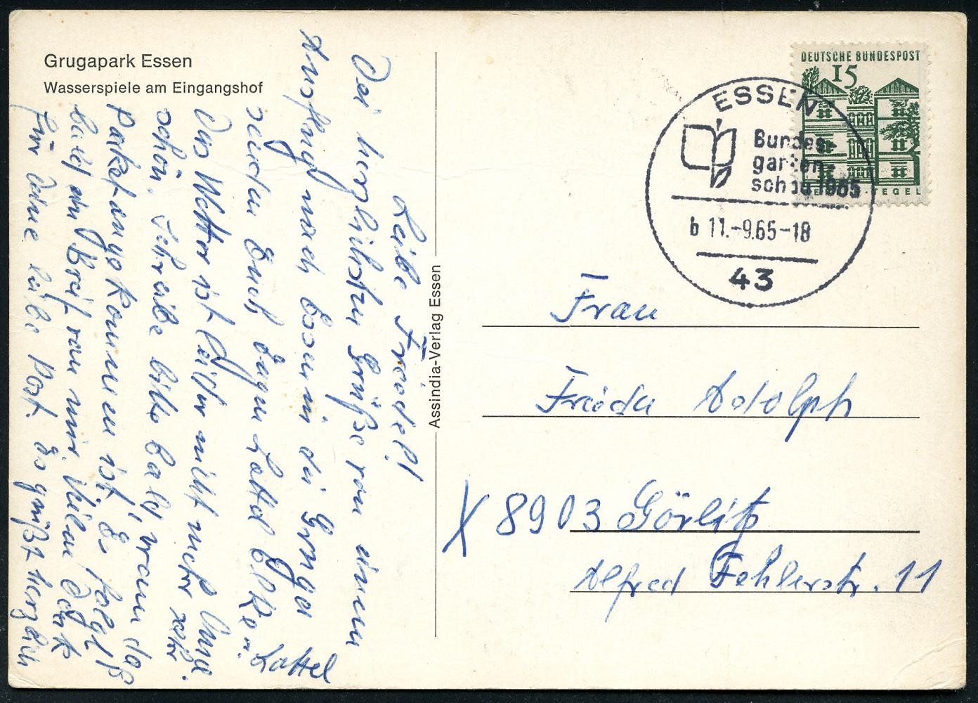 7276 | 14 € | 4300 Essen Sonder- u. Handwerbe-Stempel : 43 ESSEN/ b/ Bundes/ garten/ schau 1965 (11.9.) SSt passender Color-Ak.: Grugapark Wasserspiele , Bedarf (Bo.167 b) | ![]() ![]() | |