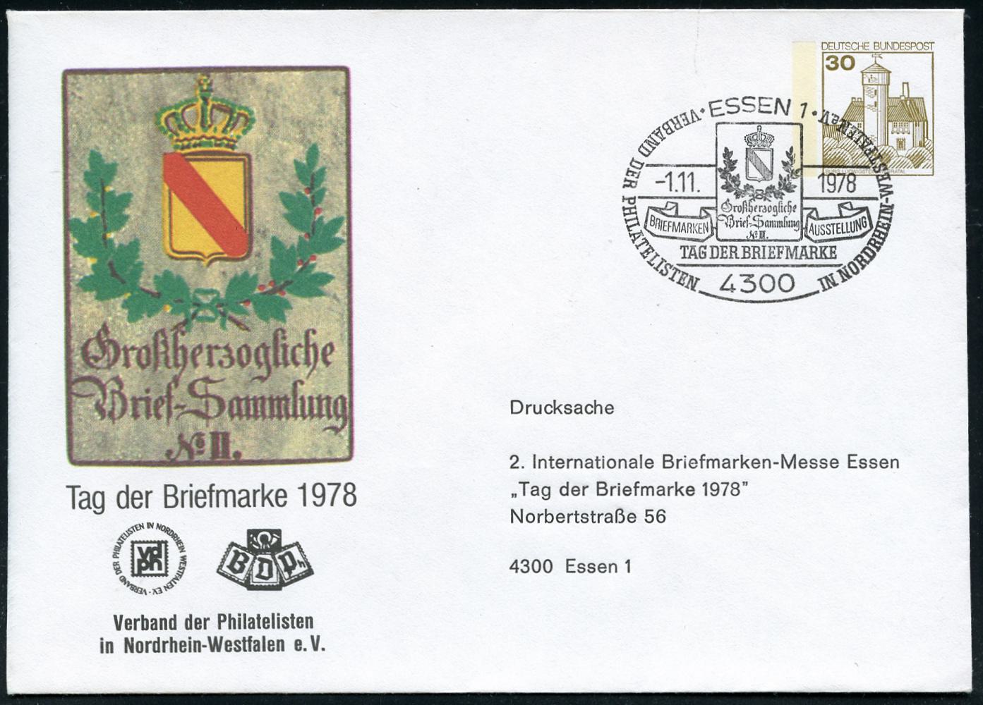 7282 | 10 € | 4300 Essen Sonder- u. Handwerbe-Stempel : ESSEN 1/ TAG DER BRIEFMARKE/ Briefm.Ausstellung 1978 (1.11.) SSt. auf motivgleichem PU 30 Pf. Tag der Briefmarke, Verband d. Philat. Nordrhein-Westfalen (bad. Postschild) Inl.-Bf. (Mi. PU 108/63b) | ![]() | |