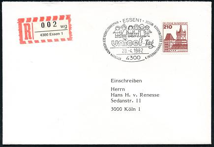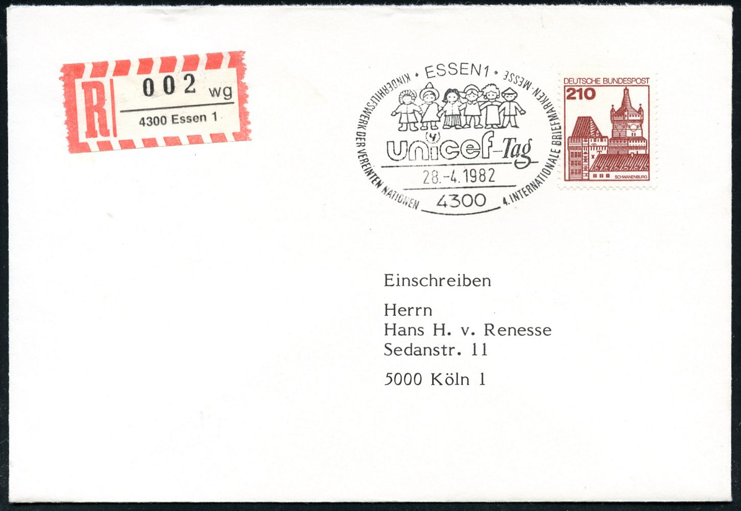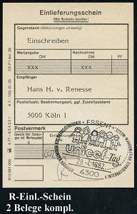 7284 | 15 € | 4300 Essen Sonder- u. Handwerbe-Stempel : 4300 ESSEN 1/ unicef-Tag/ KINDERHILFSWERK DER VEREINTEN NATIONEN 1982 (28.4.) SSt (Kinder) + RZ: 4300 Essen 1/wg auf Inl.-R-Bf. + R-Einl.Schein! , 2 Belege kompl. | ![]() ![]() | |