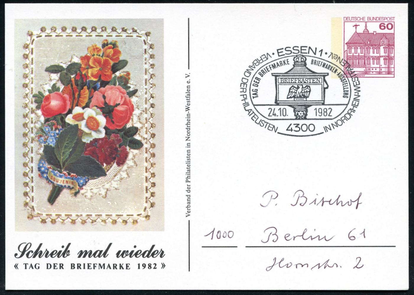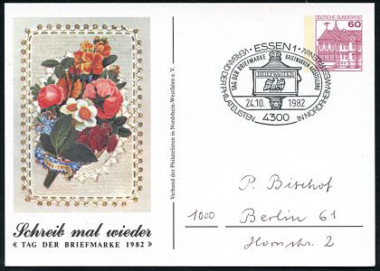 7285 | 8 € | 4300 Essen Sonder- u. Handwerbe-Stempel : 4300 ESSEN 1/ TAG DER BRIEFMARKE 1982 (24.10.) SSt. (Briefkasten) auf passender PP 60 Pf. Burgen:"Tag der Briefmarke" (Zierbrief mit Rosen etc.) Inl.-Karte (Mi. PP 106/97) | ![]() | |