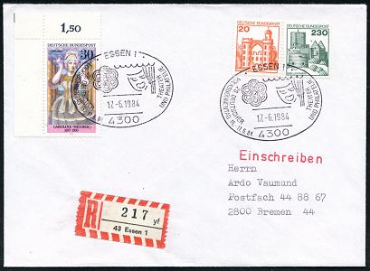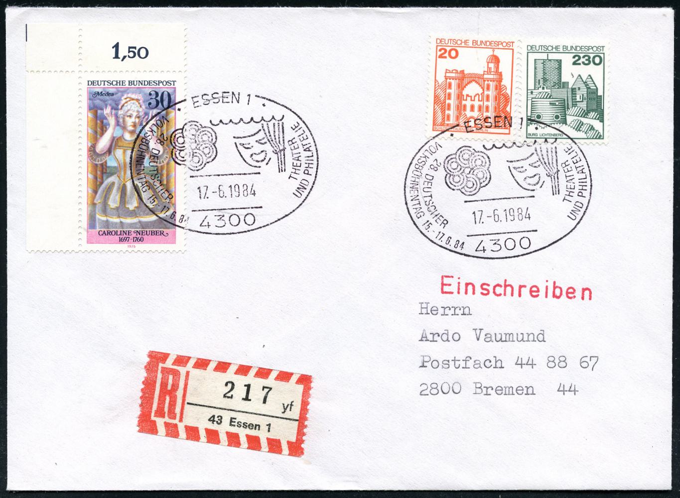 7286 | 15 € | 4300 Essen Sonder- u. Handwerbe-Stempel : 4300 ESSEN 1/ 28.DEUTSCHER/ VOLKSBÜHNENTAG.. 1984 (17.6.) SSt = Marke, Vorhang etc. 2x + RZ: 43 Essen 1/y f, klar gest. Inl.-R-Bf. (Bo.620) | ![]() | |