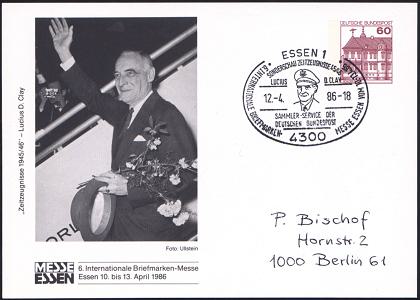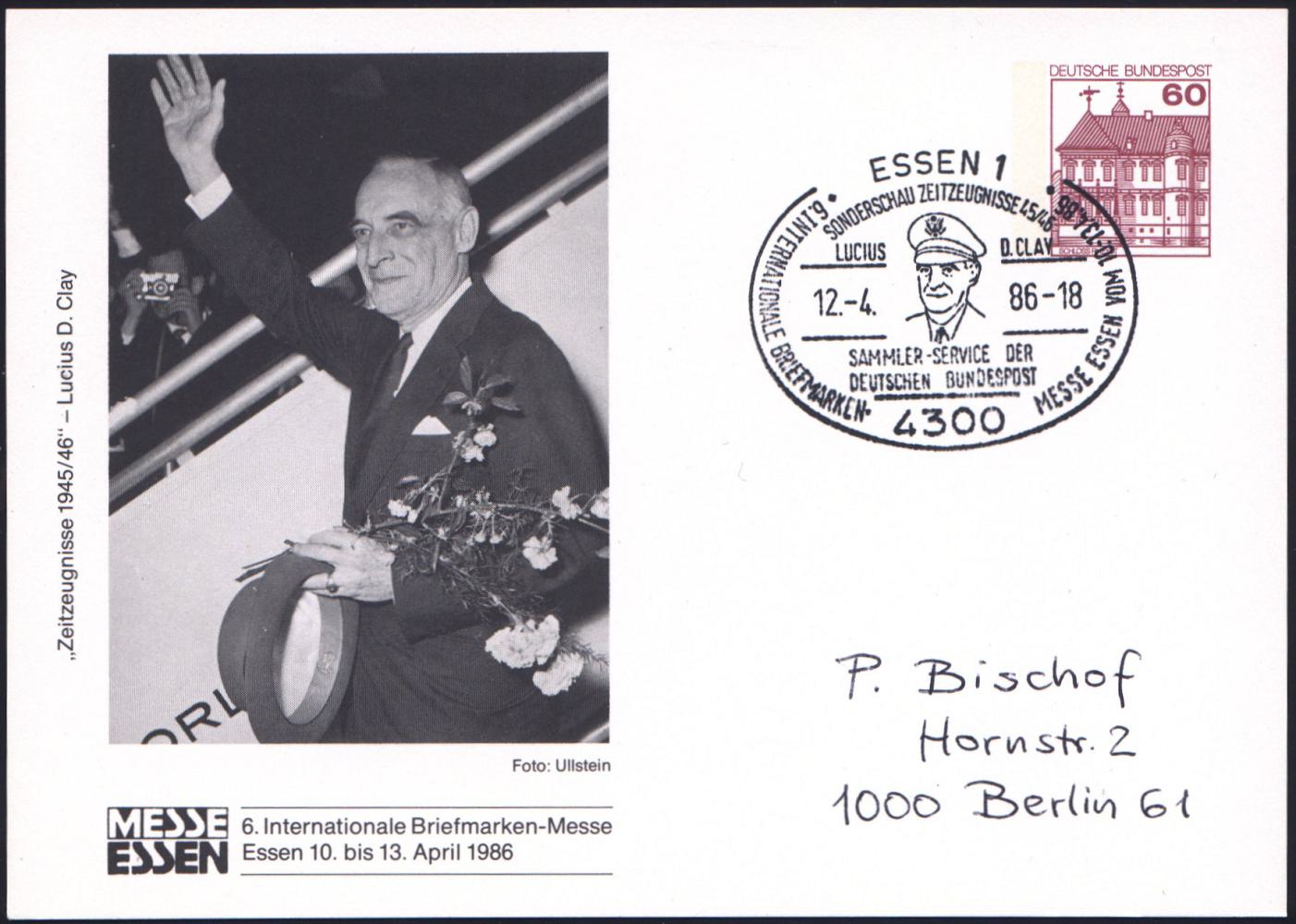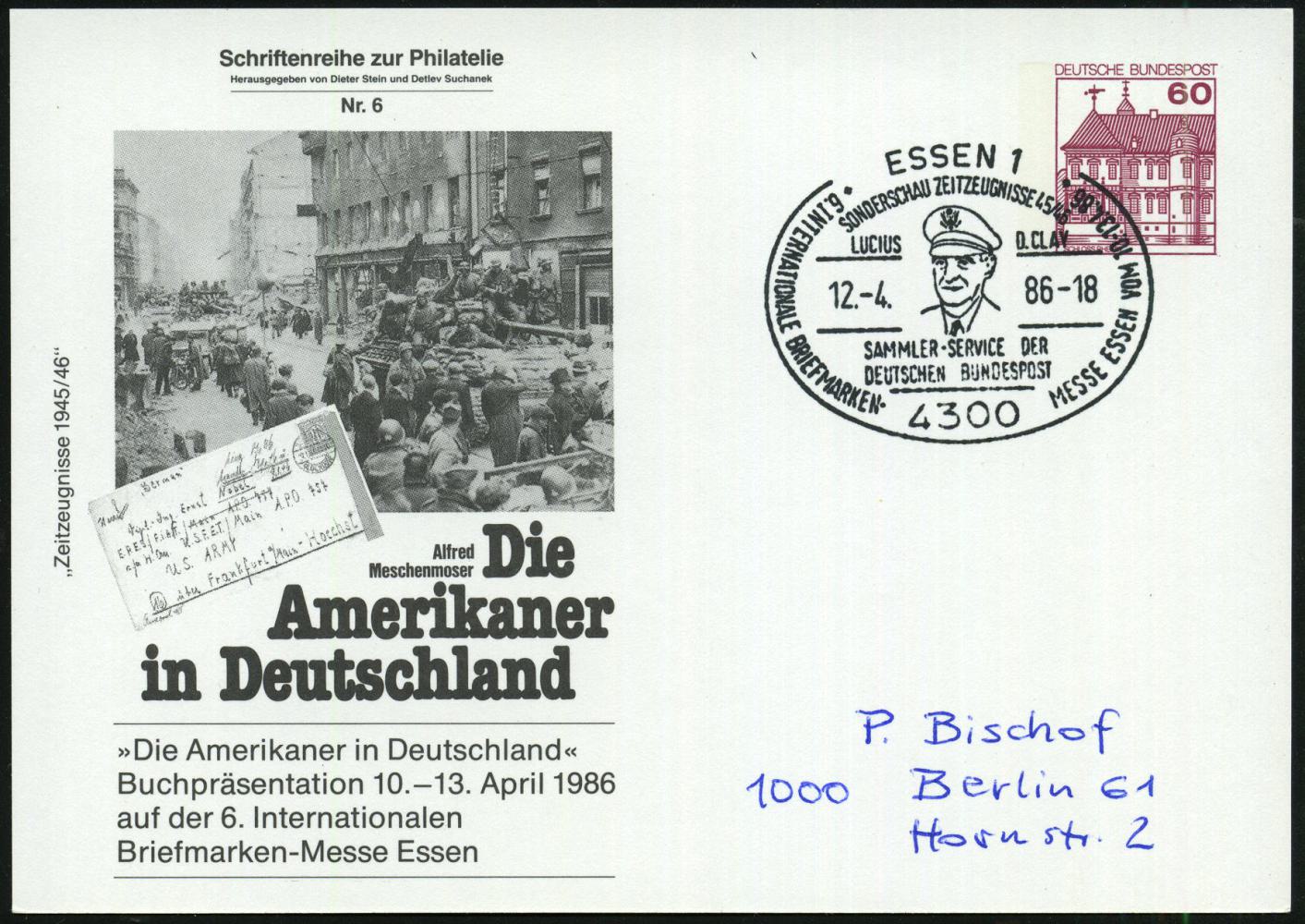 7288 | 18 € | 4300 Essen Sonder- u. Handwerbe-Stempel : 4300 ESSEN 1/ SONDERSCHAU ZEITZEUGNISSE 45-46.. 1986 (12.4.) SSt = Lucius D. Clay je 1x auf PP 60 Pf.: Lucius D. Clay bzw. Sherman-Panzer in München (Einzelverkauf möglich: je 10.- EUR) 2 Belege kompl. (Mi.PP 106/203, 204) | ![]() ![]() | |