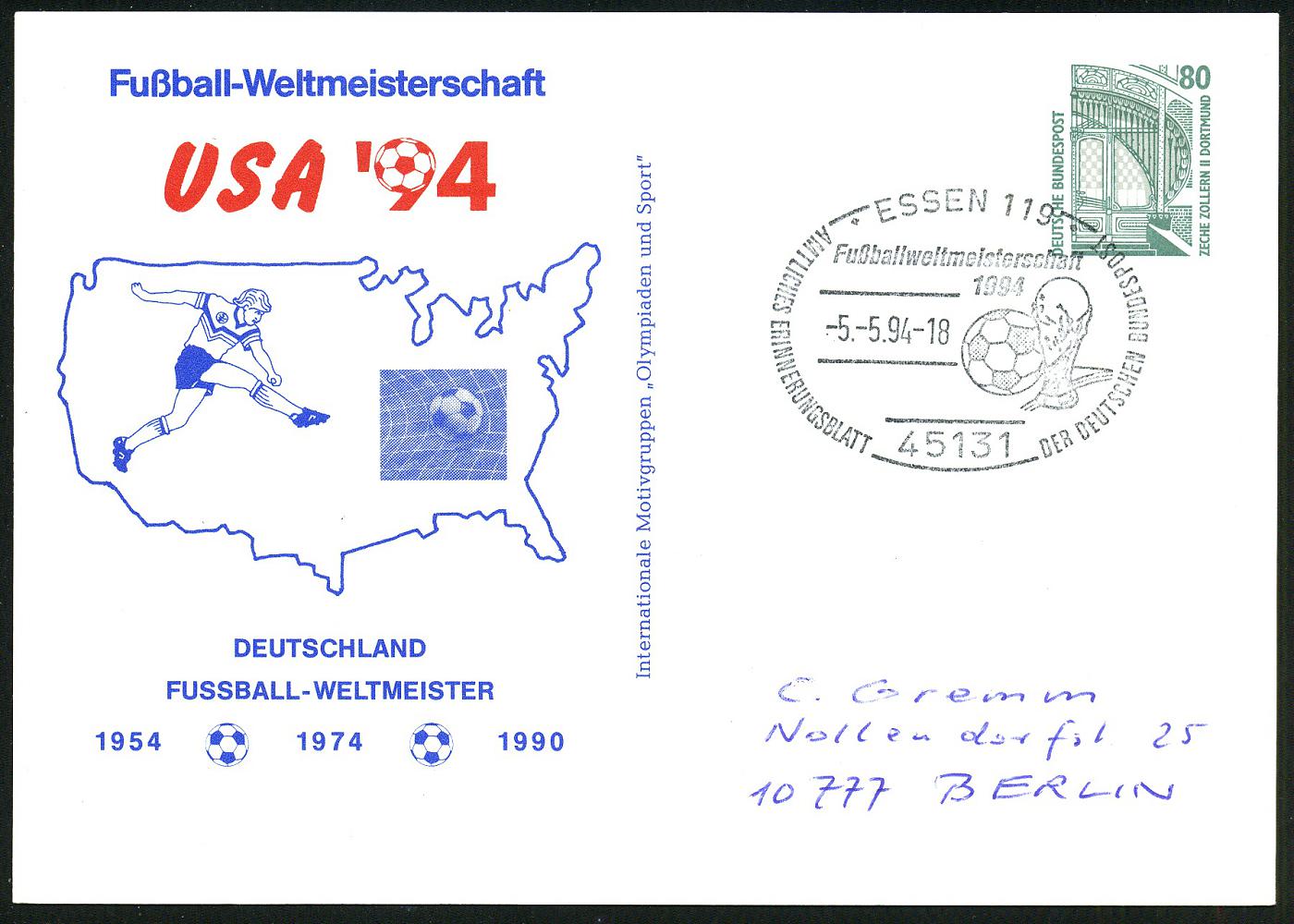 7290 | 10 € | 4300 Essen Sonder- u. Handwerbe-Stempel : 45131 ESSEN 119/ Fußballweltmeisterschaft.. 1994 (5.5.) SSt = Fußball, WM-Pokal auf PP 80 Pf. Bauwerke: Fußball-WM USA ´94.. (USA-Karte mit Spieler etc.), Inl.-Kt. (Mi.PP 153) | ![]() | |