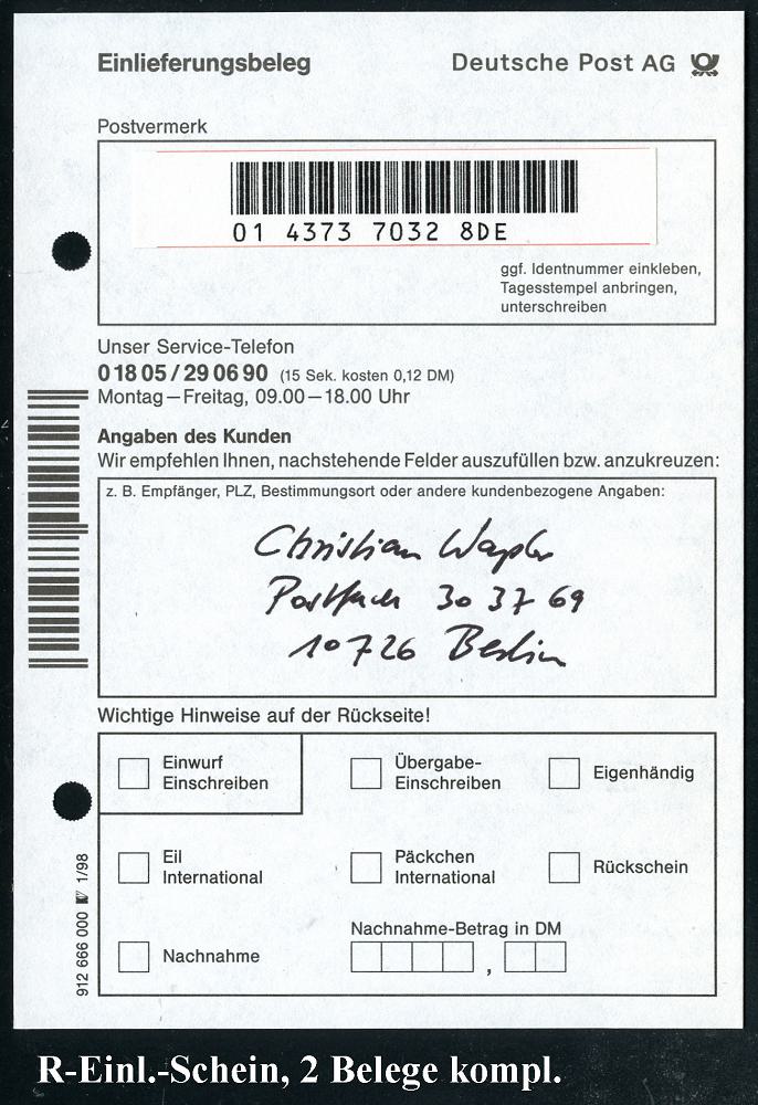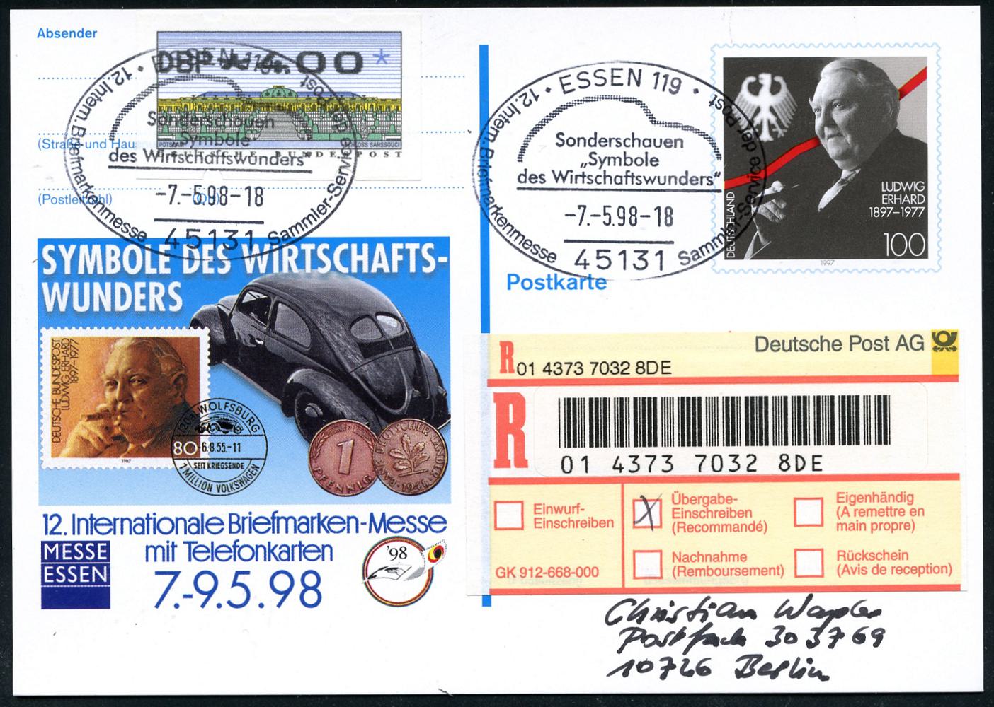 7292 | 15 € | 4300 Essen Sonder- u. Handwerbe-Stempel : 45131 ESSEN 119/ .."Symbole/ des Wirtschaftswunders".. 1998 (7.5.) SSt = VW-Käfer Silhouette auf Sonder-P 100 Pf. "Ludwig Erhard" = VW-Käfer (u. L. Erhardt, VW 1955 etc.) + ATM 400 Pf., Inl.-R-Kt. + R-Einl.Schein, 2 Belege kompl.! (Mi.PSo.51) | ![]() ![]() | |