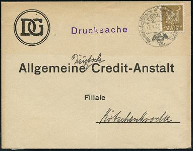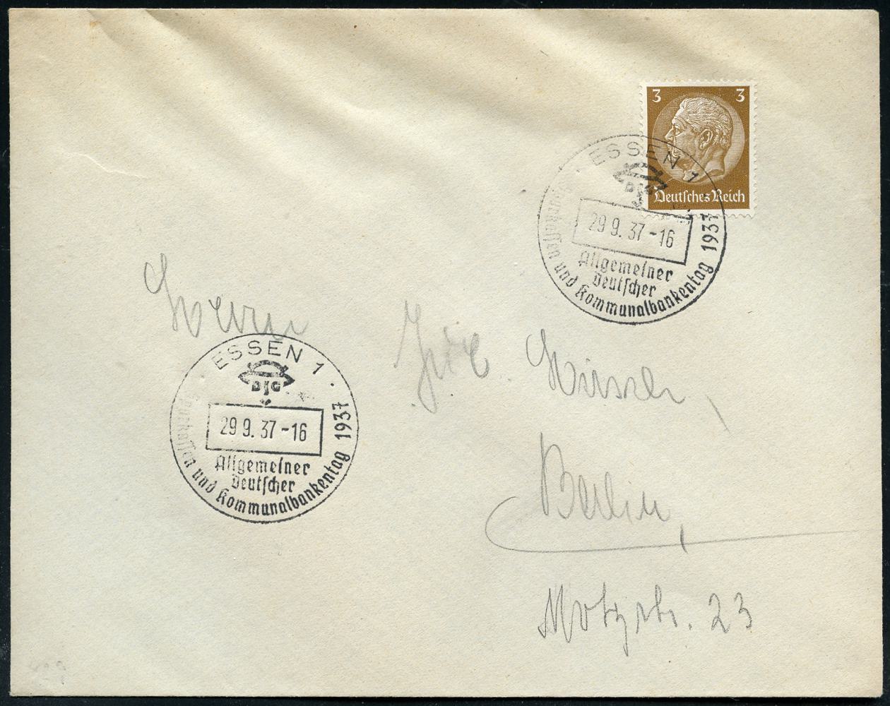 7245 | 20 € | 4300 Essen Sonder- u. Handwerbe-Stempel : ESSEN 1/ Allgem./ Deutscher/ Sparkassen-u.Kommunalbankentag 1937 (29.8.) SSt = Merkurkopf , 2x auf Inl.-Bf. (Bo.28) | ![]() | |