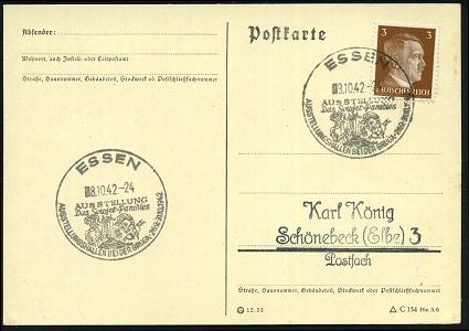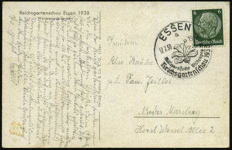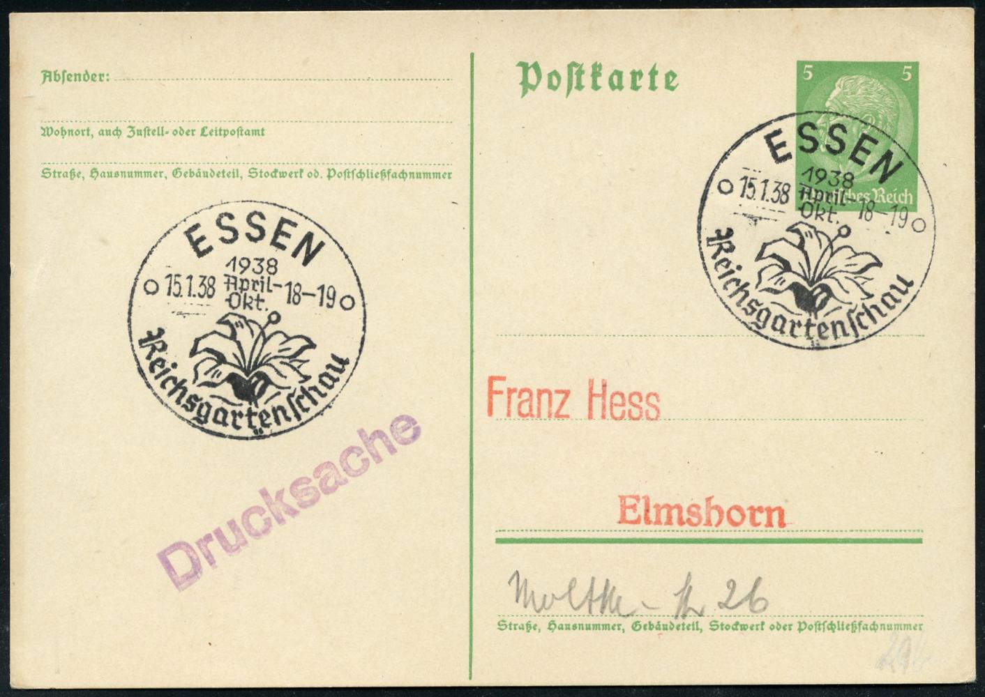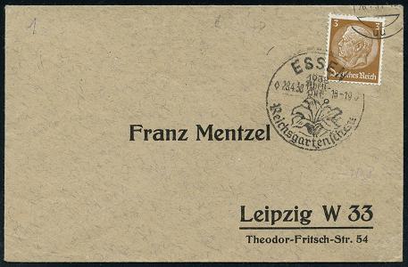 7246 | 20 € | 4300 Essen Sonder- u. Handwerbe-Stempel : ESSEN/ Reichsagartenschau 1938 (15.1. / 28.4.) 2 verschiedene SSt , 1x 2 Kreise, 1x 2 Rauten (je Blüte) Inl.-Karte bzw. Lotterie-Bf. (Einzelverkauf möglich: je 12.- EUR), 2 Belege (Bo.29 II, III, nur 1938 verwendet) | ![]() ![]() | |