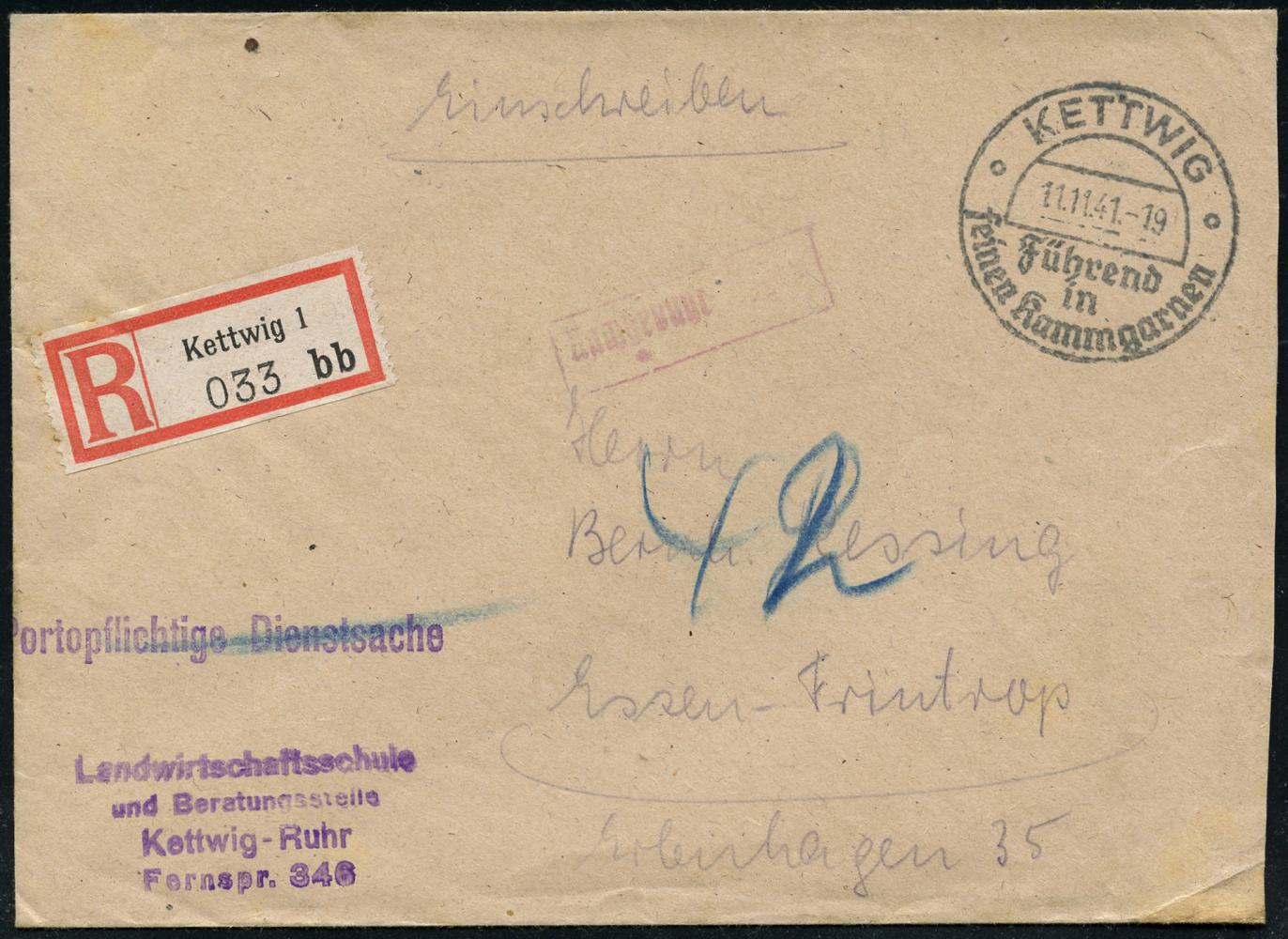 7252 | 22 € | 4300 Essen Sonder- u. Handwerbe-Stempel : Essen-Kettwig 1941 (11.11.) HWSt.: KETTWIG/ Führend/in/feinen Kammgarnen + RZ: Kettwig 1/ b b + viol. Abs.-4L: Landwirtschaftsschule/u. Beratungsstelle Kettwig.. + Ra.: Nachgebühr ("42 Pf.") Fern-Dienst-Nachgebühr-R-Bf. (rechts gering verkürzt) n. Essen-Frintrop, rs. AS. (Bo.2) | ![]() ![]() | |