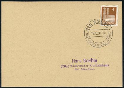 7259 | 18 € | 4300 Essen Sonder- u. Handwerbe-Stempel : (22a) ESSEN 1/ Delegiertentag der Jugend.. 1950 (15.10.) seltener SSt klar auf Inl.-Drs.-Karte (Bo.52) | ![]() | |