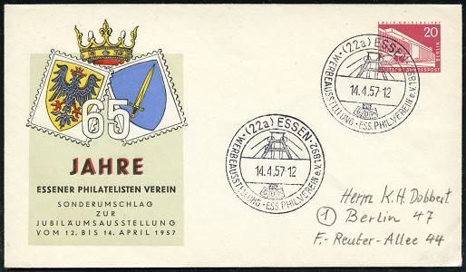 7264 | 18 € | 4300 Essen Sonder- u. Handwerbe-Stempel : (22a) ESSEN/ WERBEAUSSTELLUNG ESS.PHIL.VEREIN E:V.1892 1957 (14.4.) SSt = Grubenturm auf passendem PU 20 Pf. FU Berlin: 65 JAHRE ESSENER PHILATEL. VEREIN (Krone, Wappen, Mi.PU 18/2) Inl.-Bf. | ![]() | |