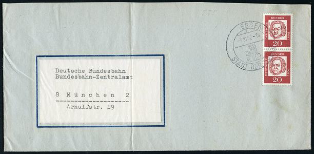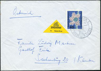 7271 | 18 € | 4300 Essen Sonder- u. Handwerbe-Stempel : ESSEN 17/ a/ STADT DER KOHLE 1963 (14.5.) aptierter HWSt = alte PLGZ entfernt auf EF 40 Pf. "Flora u. Philatelie" (Mi.395 EF + 12.- EUR)+ amtl. Aufkleber: 43 Essen-Kray/VERGISS MEIN NICHT:/DIE POSTLEITZAHL/43 Essen-Kray , seltener Ausl.-Bf.!, interessante Kombination! (Bo.125 a , aptiert!) | ![]() | |