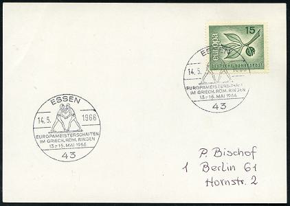 7277 | 15 € | 4300 Essen Sonder- u. Handwerbe-Stempel : 43 ESSEN/ EUROPAMEISTERSCHAFTEN/ IM GRIECH.RÖM.RINGEN 1966 (14.5.) SSt (2 antike Ringer) Inl.-Karte (Bo.185) | ![]() | |