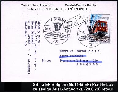 7278 | 18 € | 4300 Essen Sonder- u. Handwerbe-Stempel : 43 ESSEN 1/ 3.VERKEHRSAUSSTELLUNG/ SCHINE U.STRASSE 1970 (29.8.) SSt auf Belfien EF 3 F. "Tag der Briefmarke" = E-Lok (Mi.1545 EF) zulässige Ausl.-Antwort-Retour-Kt. n. Belgien, seltene Kombination & Unikat! | ![]() | |