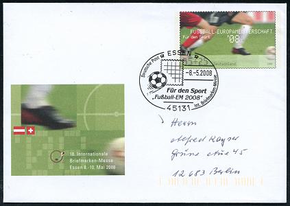 7294 | 5 € | 4300 Essen Sonder- u. Handwerbe-Stempel : 45131 ESSEN/ Für den Sport/ "Fußball-EM 2008" 2008 (8.5.) SSt (Fußball) auf passender PU 55 + 25 C. Fußball-EM (18. Internat. Briefm.-Messe Essen), Bedarf | ![]() | |