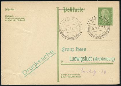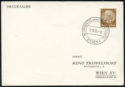 7244 | 20 € | 4300 Essen Sonder- u. Handwerbe-Stempel : ESSEN 1/ WESTFRONT 33 UND FUNKAUSSTELLUNG 1933 (16.10.) SSt klar auf Inl.-Drs.-Karte (Bo.24) | ![]() | |