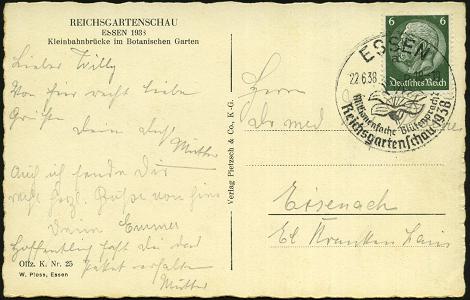 7247 | 18 € | 4300 Essen Sonder- u. Handwerbe-Stempel : ESSEN/ a/ Millionenfache Blütenpracht/ Reichsgartenschau.. 1938 (22.6.) SSt = Blüte klar auf s/w.-Sonder-Foto-Kt.: Reichsgartenschau, Kleinbahnbrücke, Botan. Garten, Bedarf (Bo.32 a) | ![]() ![]() | |