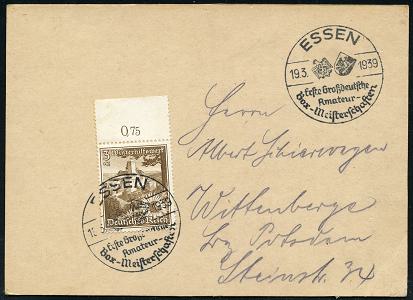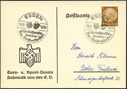 7249 | 16 € | 4300 Essen Sonder- u. Handwerbe-Stempel : ESSEN/ Erste Großdeutsche/ Amateur-/ Box-Meisterschaft 1939 (19.3.) SSt (2 Wappen) klar gest. Inl.-Drs.-Karte (Bo.33) | ![]() | |